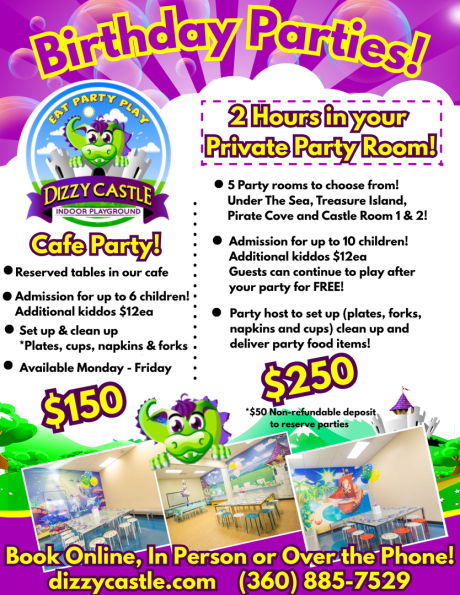 *Please remember party items such as birthday cake, presents, decorations etc are only allowed inside Dizzy Castle with a birthday party reservation.